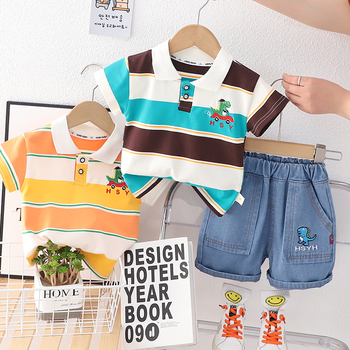 Trẻ em thời trang và đẹp trai áo polo sọc, xe khủng long nhỏ, áo ngắn tay đẹp, và quần short denim